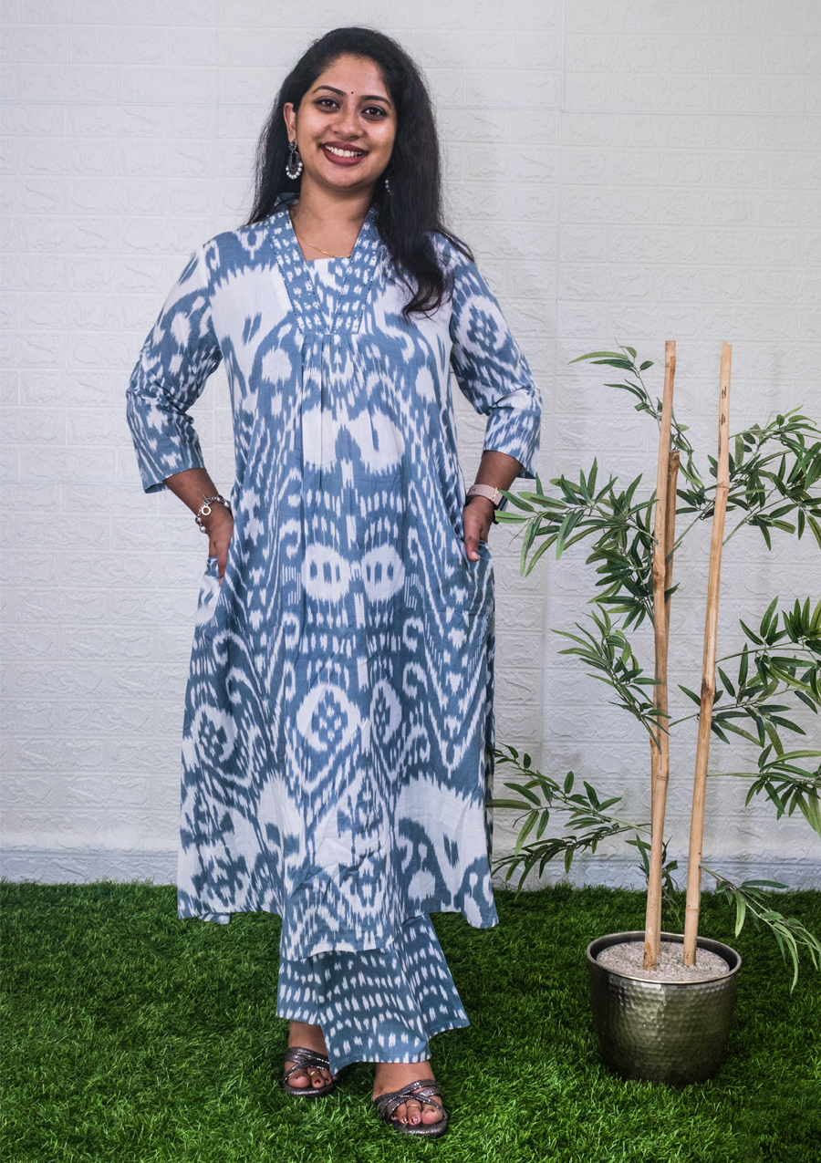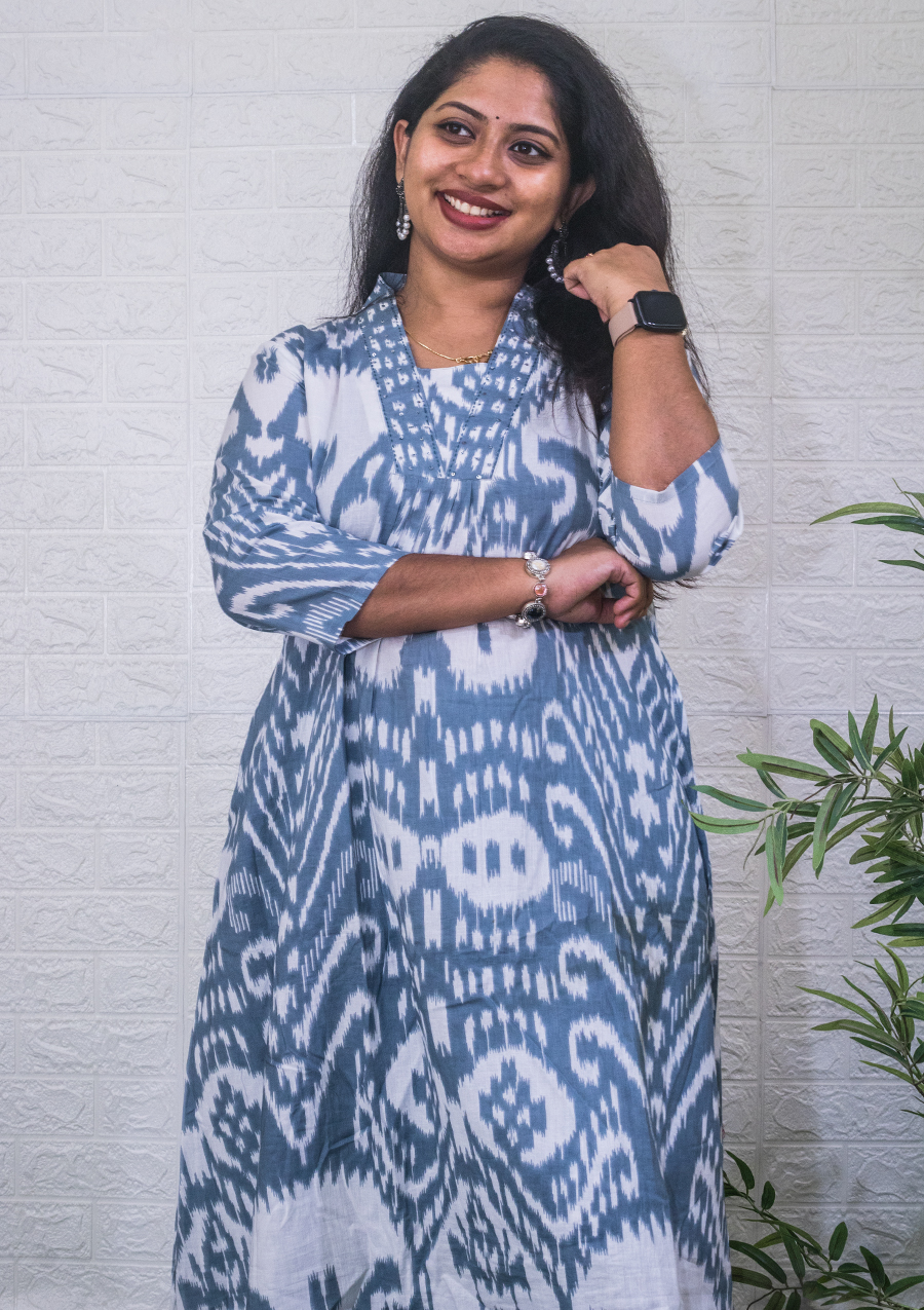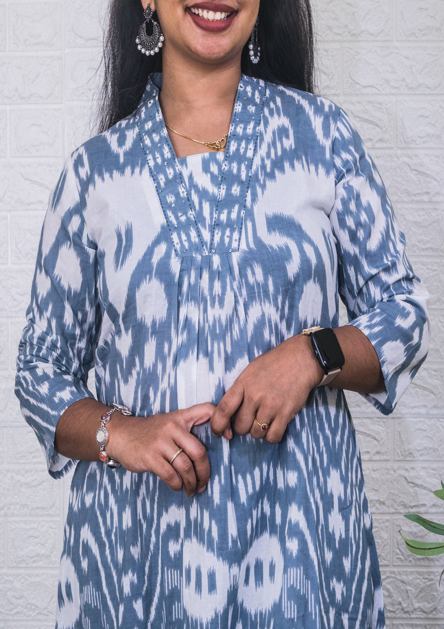 Features – Collar neck, sequence and thread detailing, Pleats, 2 side pockets, Parallel bottom